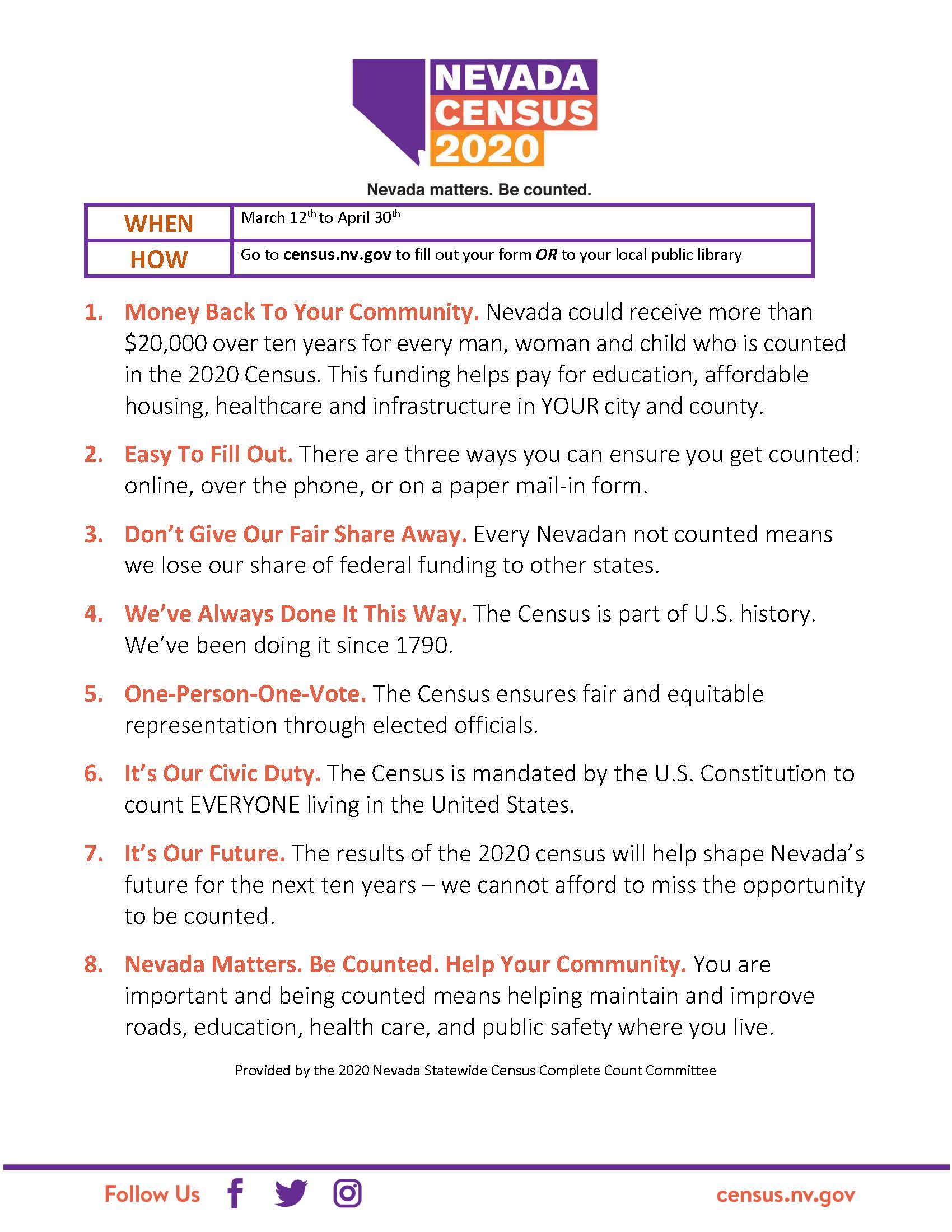 The time for Nevadans to be counted in the 2020 Census is approaching. Nevada residents will be invited to complete the census on March 12, 2020. If you are interested in becoming a Nevada Census Organizer, please see the link to the application below. Also for two (2) related Grant opportunities, see the Grant information links below.